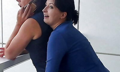 Tempting blonde with big fake knockers scissoring with her dark haired lesbian sexy counter part