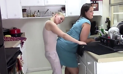 Wife boinked rigid with tongue while washing dishes in the kitchen, getting her to cum before her stepmother gets home.